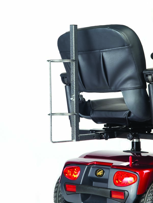 Golden’s Walker Holder can transport a standard or rolling walker and is made of a sturdy metal. It fits on the universal mounting bracket on the back of your scooter.