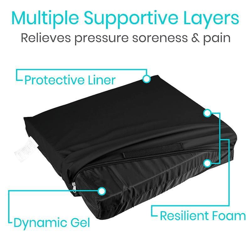 The easy-clean wheelchair cushion base is lined with nonslip grip dots to minimize shifting and sliding.