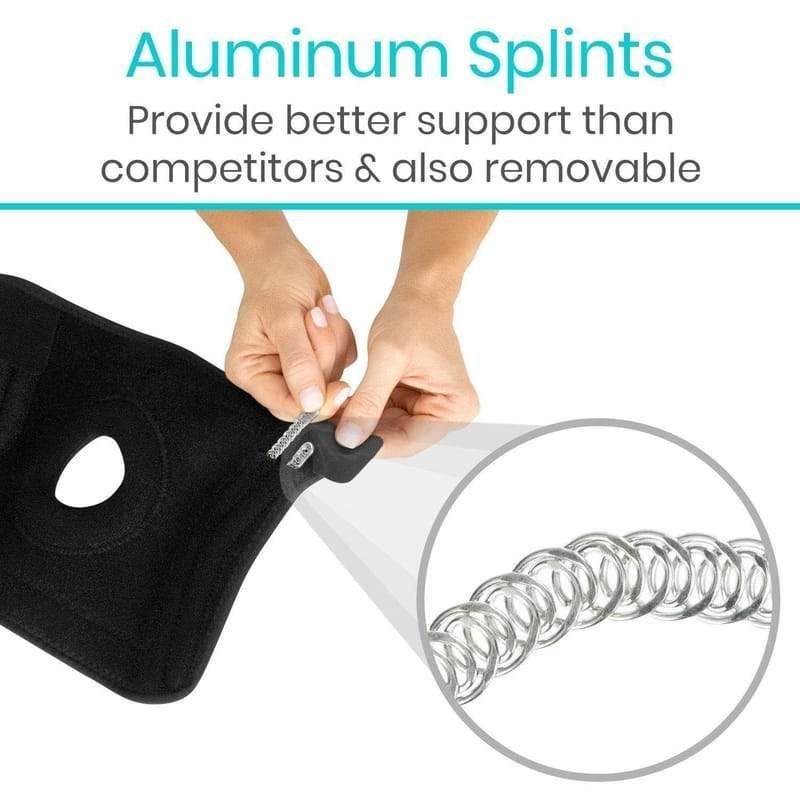 The knee brace is constructed with a soft, breathable nylon/spandex blend with a strong fastener system and silicone nonslip strips. The removable spring splints are made with lightweight aluminum.