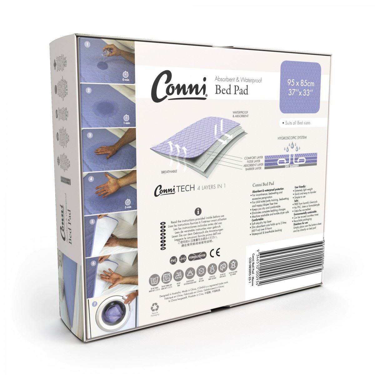 Conni Max Bed Pad Special Instructions: Please make sure to add all the items and options together to ensure proper pricing. Product Code : PCCD100100-25-1 Availability: In stock SKU: SKU 3704 Color * Please select Teal Blue (TB) Mauve (M) White Kids option Click here for Kids Print option $0.00 Qty: Add to cart Custom wishlist OK Add to wishlist Add to compare list Email a friend Soft quilted, stay-dry top layer specifically designed to draw fluid through the fabric to the highly absorbent layer. Waterproof breathable bottom layer. Built with bound edges for durability. Machine washable and tumble dryer safe, and easy to maintain. No piling, no differential shrinkage and need to worry about separation of layers. Helps to reduce Pressure Sores also known as Decubitus ulcers or Bedsores. Absorbs up to 2500ml (85 fl oz) over 8 hours! The bed pad is suitable for single or king single beds and measures 1m x 1m (39.4" x 39.4") plus tuck-ins. Soft stay-dry top layer, highly absorbent slim core, breathable PUL waterproof backing and is extremely light weight. It has durable polyester tuck-ins each side to tuck under the mattress for extra security. Simply place the bed-wetting pad on top of the bottom sheet; Colored side up; and tuck the side panels under the mattress. Lay directly on the bed pad. Care and Washing Instructions: To maintain maximum absorbency avoid using creams, lotions, oils or talcum on the skin before bedtime or directly on the Conni product. Simply warm machine wash (NOT HOT) with a good quality laundry detergent: never use fabric softeners as it puts a coating on the special fibres and interferes with the pad's absorbency. An oxygen bleach is recommended if there are any difficult stains or odors (do not use harsh bleach). Dries quickly on the clothesline or in the tumble dryer on LOW heat. Too much heat can damage the polyurethane backing. A second bed pad maybe purchased while one is laundered. The bed pad can be used with our waterproof bedding protectors: waterproof mattress protector; waterproof sheet protector and pillow protector. Machine washable and tumble dryer safe, Conni products can be used countless times! For best results, wash with WARM OR COOL water and a good quality laundry detergent. Conni Absorbent Pads dry quickly on the clothesline or in the tumble dryer on LOW heat. Too much heat can damage the polyurethane backing compromising the effectiveness of the waterproofing. Do not use fabric softeners Do not use bleach Certified PVC & Chemical Free! There is widespread concern about the use of toxic substances in fabrics used next to the skin because of the negative and sometimes long-term effects on health. Unlike many incontinence products our Bed Pads, Mattress Protectors and absorbent underwear are free of chemicals and fragrances. Our Conni products are Oeko-Tex accredited and safe to use against the skin. At Conni, we have created a proprietary blend of micro-fiber for our waterproof barrier in place of PVC due to its toxicity. For detailed information refer to Technology and Standards. Waterproof and breathable Soft stay-dry top layer Slim absorbent core holds up to 85 fluid oz over 8 hours Tuck-ins work best with restless sleepers on a Twin size bed Fabric is comfortable and quiet; ensuring a restful night’s sleep Extremely lightweight Eliminates complete bedding changes Quick and easy to launder Product Dimensions: With Tuck-Ins - 39 inches x 39 inches Product tags Conni (18) , teal blue (3) , Bed Pad (2) , BedPad (2) , Max BedPad (1) , kids (4) , mauve (2) Customers who bought this item also bought Conni Mate Bed Pad Special Instructions: Please make sure to add all the items and options together to ensure proper pricing. Product Code : PCCD085095-25-1 $0.00 Add to cart Add to compare list Custom wishlist OK Add to wishlist Conni Chair Pad Special Instructions: Please make sure to add all the items and options together to ensure proper pricing. Product Code : PCCD-SIZE-25-1 $0.00 Add to cart Add to compare list Custom wishlist OK Add to wishlist Conni Mattress Protector Special Instructions: Please make sure to add all the items and options together to ensure proper pricing. Product Code : P88-MP $0.00 Add to cart Add to compare list Custom wishlist OK Add to wishlist Conni Kid's Tackers Training (Boxer Style) Reusable Incontinence Pants Special Instructions: Please make sure to add all the items and options together to ensure proper pricing. Product Code : P5802 $20.00 Add to cart Add to compare list Custom wishlist OK Add to wishlist