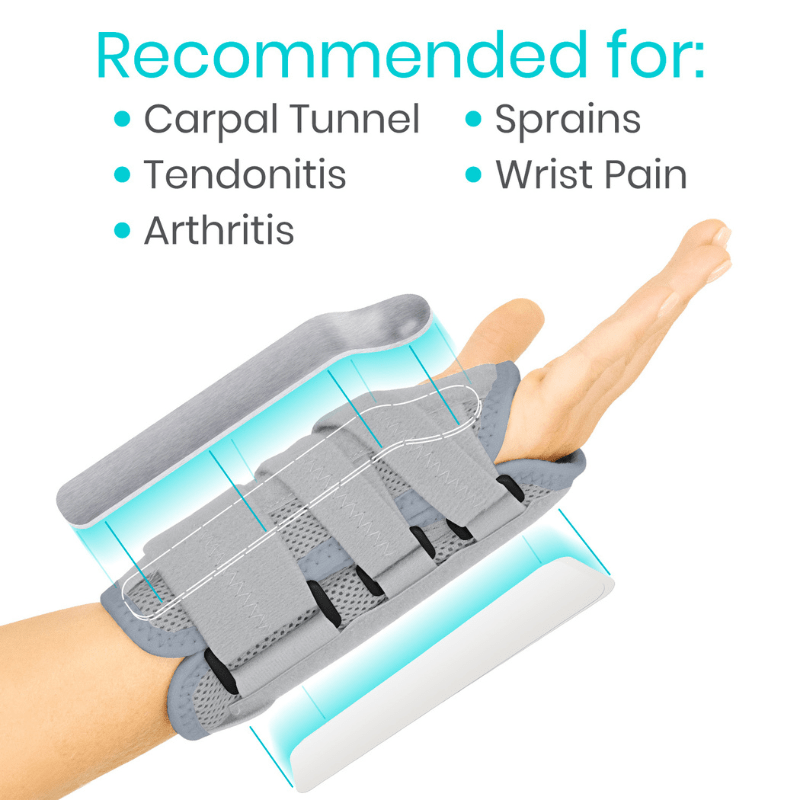 The wrist brace relieves pain, inflammation and swelling caused by arthritis, carpal tunnel, tendonitis, repetitive stress injury, post-surgery, sprains and strains.
