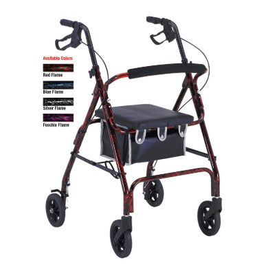 Rollator: Basic & Bariatric Special Instructions: Please make sure to add all the items and options together to ensure proper pricing. Product Code: PPB1025-XX SKU: PPB10AB-XY Models * Please select Basic / Standard (Wt.Capacity=250lbs) [+$80.00] Bariatric (Wt. Capacity = 400lbs) [+$278.00] Color * Please select Metallic Black Metallic Blue Metallic Red Metallic Green Color * Please select Flame Red Flame Blue $0.00 Qty: Add to cart Custom wishlist OK Add to wishlist Add to compare list Email a friend Basic Rollator Features: Lightweight welded aluminum frame with 31.5" – 35.5" adjustable handles and locking loop brakes. Easily folds for storage and transportation with built-in fold strap. Comes with removable storage pouch and back bar. Specifications: 6" polyurethane tires. Padded Seat: 14"W x 13"D Width between handles: 18"-19" 21"  to 22" seat-to-floor height. Weight capacity: 300 lbs Color Options: BK - Metallic Black BL - Metallic Blue RD - Metallic Red GR - Metallic Green Bariatric Rollator Features: Welded lightweight aluminum frame feature locking loop brakes, large 8" polyurethane wheels and large padded seat. Comes with large storage bag Dimensions: • 18" wide by 13" deep seat • 33" to 38" handle adjustment • 24" seat-to-floor height • 22 1/2" width between handles • 29" overall width. • Weight capacity: 400 lbs PPB1033BL — Flame Blue PPB1033RD— Flame Red (*) Customer Pick up from the showroom - No Charge. Please schedule pickup verify availability. Product tags Bariatric (2) , rollator (5) , Basic (1)