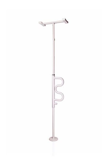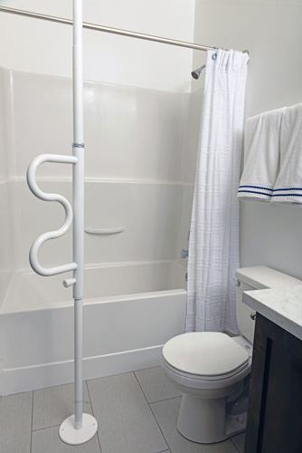 The Security Pole & Curve Grab Bar makes it easy to stand from a couch, bed, or toilet. It is tension mounted so it can be placed anywhere in the home - no screws or bolts required. The Curve Grab Bar has 4-Hand grips that make it easy to climb to a standing position â and because the grab bar rotates 360 degrees â you can move the grab bar out of the way when not in use. And like all our products, it blends in with your home to offer extra support without intruding on the comforting feeling of your home.