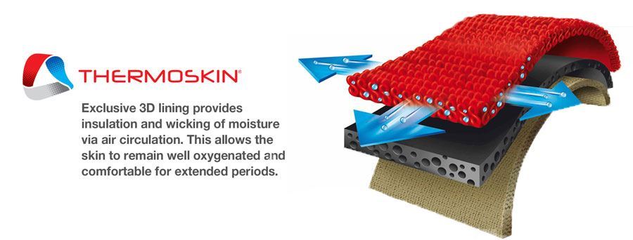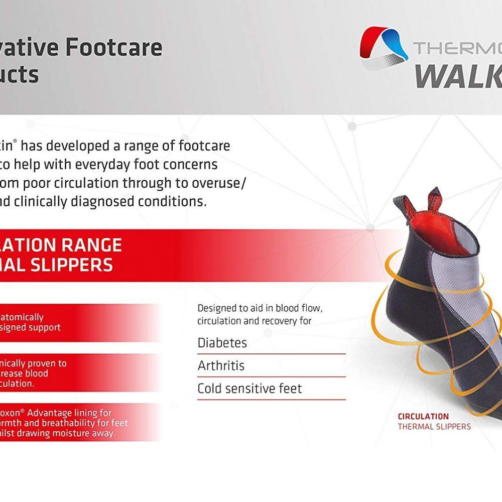 Thermoskin Circulation Thermal Slippers Sold in Pairs Special Instructions: Please make sure to add all the items and options together to ensure proper pricing. Product Code: P8Y132 SKU: P8Y132 Size * Please select S M L XL $52.00 Qty: Add to cart Custom wishlist OK Add to wishlist Add to compare list Email a friend Thermoskin provides effective treatment and pain relief for sports Injuries, Arthritis, Repetitive Strain Injuries and many other conditions. Thermoskin combines Compression, support and naturally generated body heat for therapy and pain relief. Benefits: Facilitates increased blood flow promoting enhanced recovery Provides Light but firm compression to counteract tissue swelling Clinically tested to increase skin and muscle temperature Provides heat therapy and pain relief Increases reactivity and elasticity of the muscle. Sold as a pair. The TRIOXON ADVANTAGE: Soft comfortable inner layer of Trioxon wicks away moisture middle Layer helps increase skin temperature for heat therapy Outer layer provides light compression Materials: Nylon, Spandex, Rubber, Foam, Polyester. Does not contain Latex. Sizing: Warning: If you have diabetic foot ulcers, or if pain persists please consult with your medical professional. Instructions While holding slippers, slip your feet inside. Use the tabs at the back of the slippers to pull it up over the heels. Slippers are universal, can be worn on left or right foot. Warning: If you have diabetic foot ulcers, or if pain persists please consult with your medical professional. Product tags Thermoskin (6) , Circulation (2) , diabetes (2) , arthritis pain (2) , Slippers (1) , heat therapy (1) , Raynaud's syndrome (1) , sensitive feet (1)