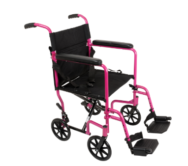 Transport Wheelchair Type * Please select TRANSPORT WC 19X16 W/FOOTREST BLACK ALUM [+$180.82] TRANSPORT WC 19X16 W/FOOTREST BLUE, ALUM [+$180.82] TRANSPORT WC 19X16 W/FOOTREST PINK, ALUM [+$180.82] TRANSPORT WC W/12" REAR WHEELS BLACK, ALUM [+$262.28] TRANSPORT WC 19X16 W/FOOTREST SILVER VEIN, STEEL [+$160.72] TRANSPORT WC W/12" REAR WHEELS 22X18 SILVER VEIN, STEEL [+$321.52] TRANSPORT WC 19X16 W/FOOTREST BURGUNDY, ALUM [+$180.82] $0.00 Qty: Add to cart Custom wishlist OK Add to wishlist Add to compare list Email a friend The ProBasics Aluminum Transport Chair is a compact, lightweight design with an easy-to-maintain finish. The flared handles and handy back-release hinge allow the back to fold down flat and compact for easy storage and transport. Comes complete with seat belt, tool-free swing-away composite footrests and heel loops. Fits patient weights up to 300 pounds. Lightweight aluminum construction (only 20 lbs) Flared handles and handy back-release hinge allow the back to fold down flat and compact for easy storage and transport Stylish aluminum frame with permanent rear axel for strength and durability Color: pink, Blue, Black, Burgundy, Sliver Padded full-length permanent armrests Padded nylon upholstery is comfortable, lightweight and easy to clean Seat belt for added safety Nylon seat straps allow for ease of folding and lifting Push-to-lock rear wheel locks Composite 8" wheels with solid rubber tires are lightweight and maintenance free Tool-free, swing-away composite footrests with heel loops included HCPCS Code: E1038*  WARNING: This product can expose you to chemicals including Lead, which is known to the State of California to cause cancer or birth defects or other reproductive harm. For more information, visit www.P65Warnings.ca.gov.  Product Brochure Click Here Warranty : Limited lifetime on frame; One year on all parts Armrests : Fixed Full-Length Arms Seat Width :19" Front Riggings : Swing-Away Footrests Wheels : 8" Material : Aluminum Weight Capacity : 300 lbs. Product Weight : 20 lb. Color : Pink, Blue, Black, Burgundy, Sliver Footrest : Yes