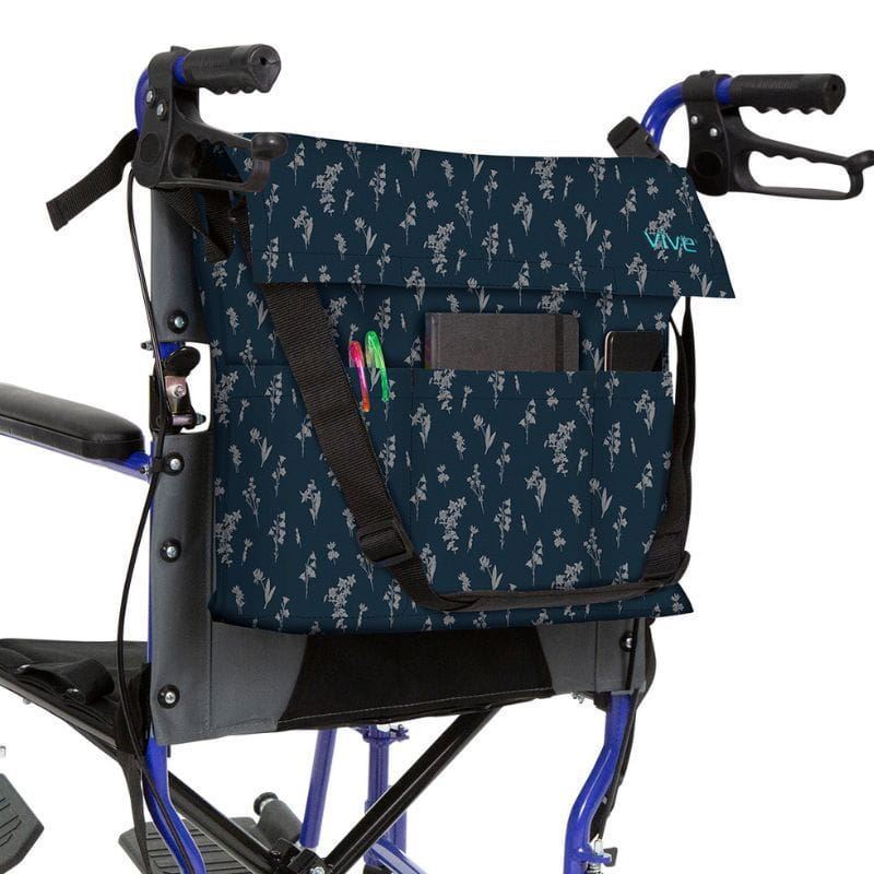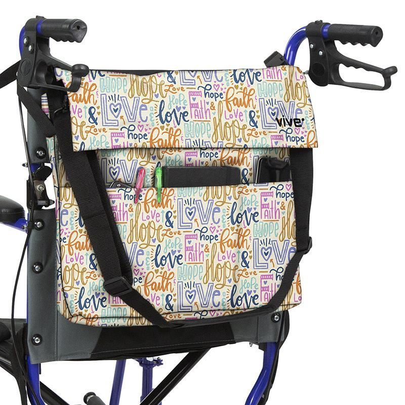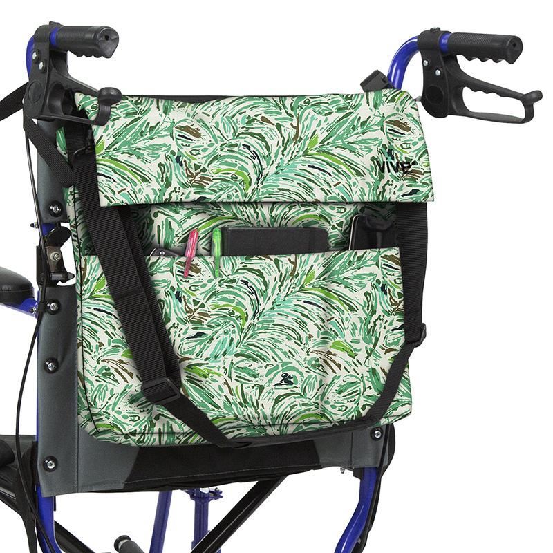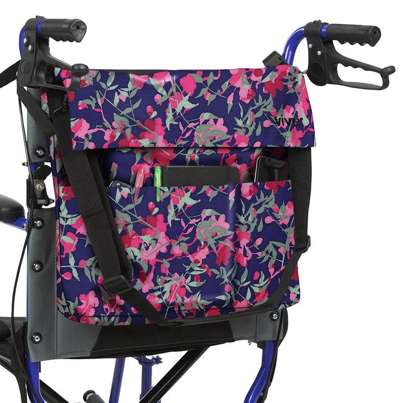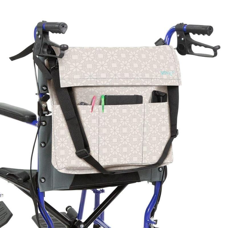 The bag includes two adjustable straps. First, buckle each strap around the base of each wheelchair handle or on opposite sides of the push bar. Tighten the straps for a secure fit that minimizes swinging and sagging.