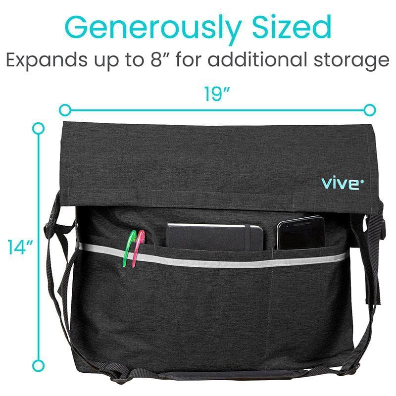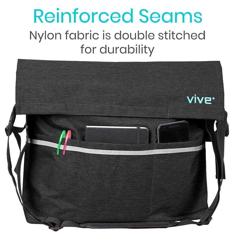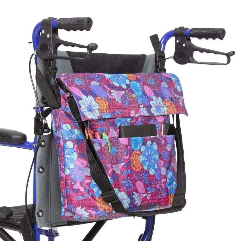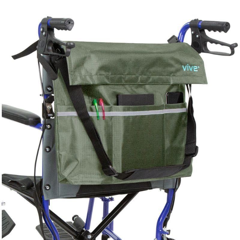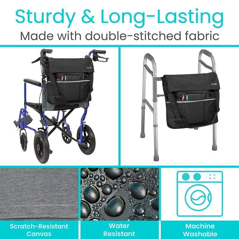 The bag includes two adjustable straps. First, buckle each strap around the base of each wheelchair handle or on opposite sides of the push bar. Tighten the straps for a secure fit that minimizes swinging and sagging.